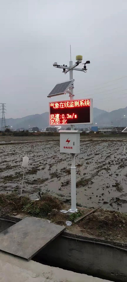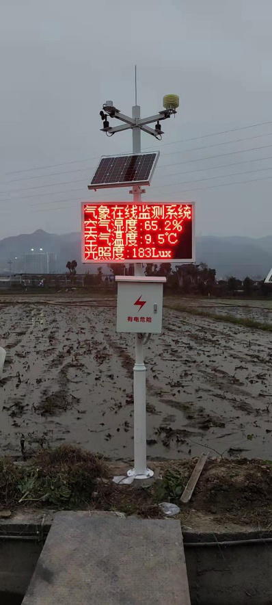 氣象墑情監測系統包含農業智能小型氣象站、數據展示LED屏等,監測要素涵蓋了風速、風向、溫濕度、光照度等農業生產經營要素